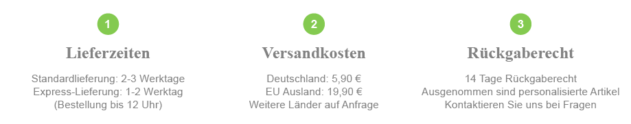 Bei Bedrucken von Gläsern kann es zu einer Über- / Unterlieferung von 10% kommen. Berechnet wird die tatsächlich gelieferte Menge. Bei einer Unterlieferung erhalten Sie umgehend eine Gutschrift des zu viel gezahlten Betrags, bei einer Überlieferung stellen wir die Überlieferten Gläser mit der Zusendung der Ware in Rechnung.