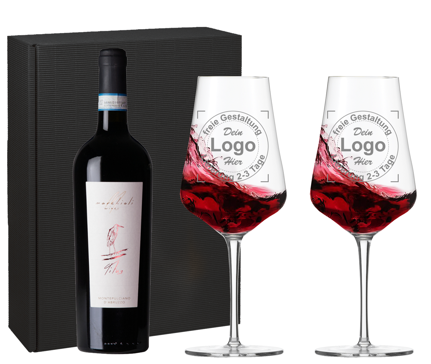 Das Set besteht aus zwei gravierten Weingläsern der Serie Fine, inkl. einer Flasche Wein sowie einer passenden Geschenkverpackung.