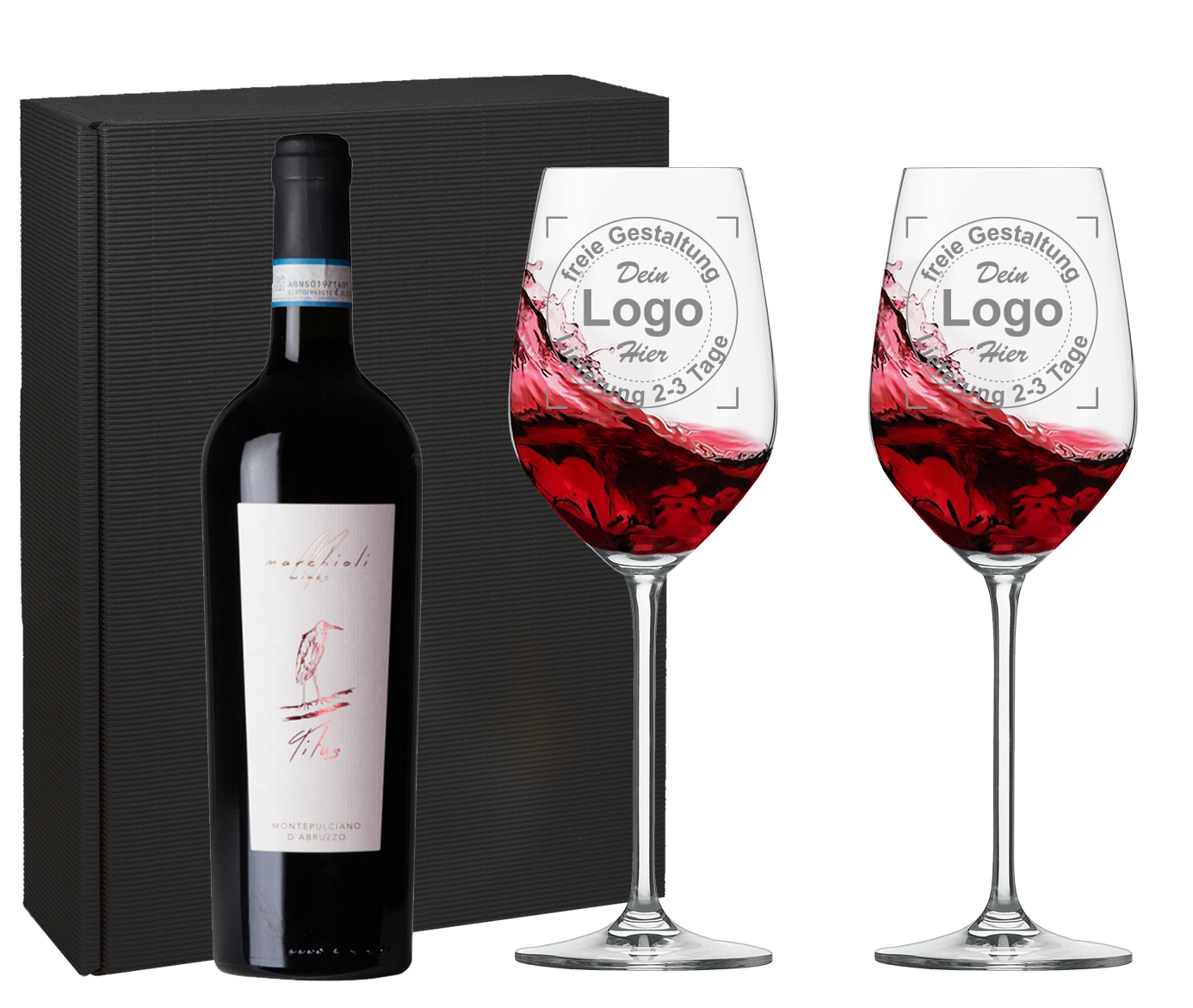 Das Set besteht aus zwei gravierten Weingläsern der Serie Fortissimo, inkl. einer Flasche Wein sowie einer passenden Geschenkverpackung.