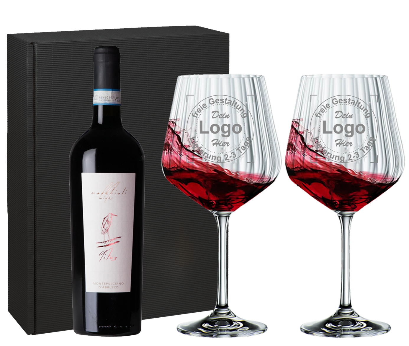 Das Set besteht aus zwei gravierten Weingläsern der Serie Nachtmann, inkl. einer Flasche Wein sowie einer passenden Geschenkverpackung.