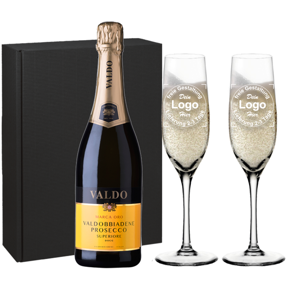 Das Set besteht aus zwei gravierten Sektgläsern der Serie Ciao+, inkl. einer Flasche Prosecco sowie einer passenden Geschenkverpackung.