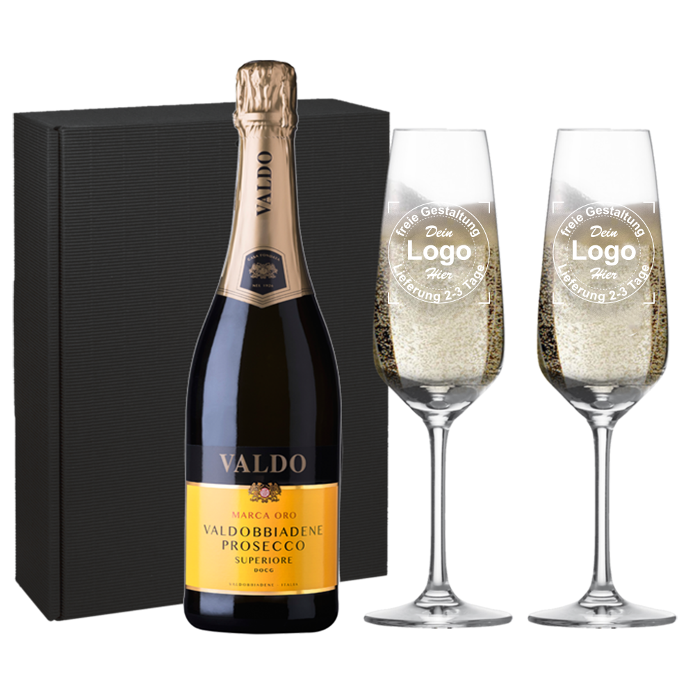 Das Set besteht aus zwei gravierten Sektgläsern der Serie Taste, inkl. einer Flasche Prosecco sowie einer passenden Geschenkverpackung.