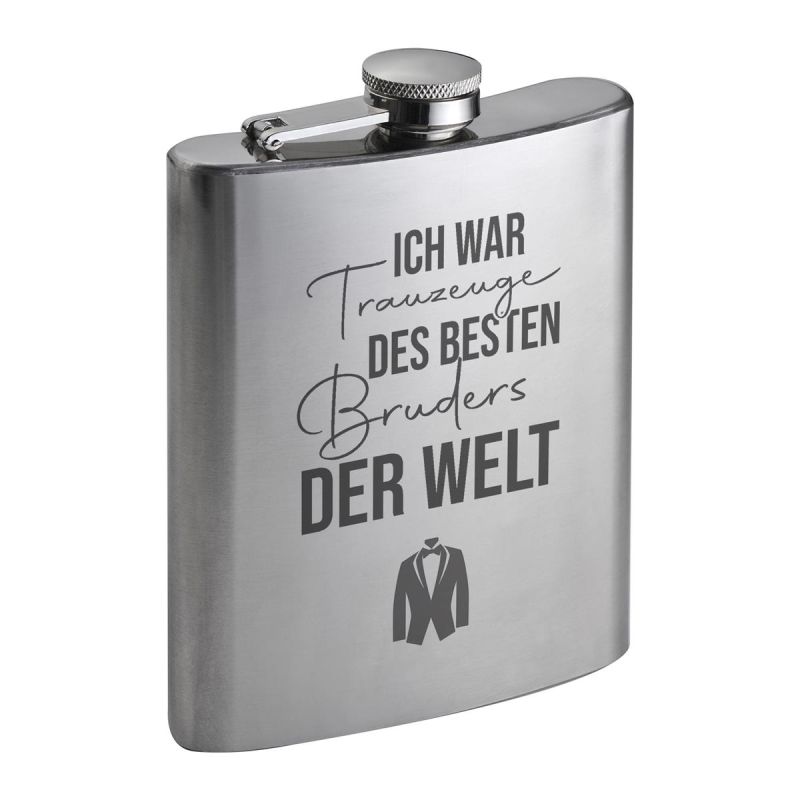 Ein Flachmann ist nicht nur praktisch, sondern auch ein Zeichen von Stil und Individualität. Er ist ein beliebtes Geschenk für den Bräutigam und bietet eine schöne Möglichkeit, an den besonderen Tag zu erinnern. Kombinieren Sie den Flachmann mit einem passenden Zubehör wie einem Whiskyglas oder einem edlen Set für ein noch persönlicheres Geschenk.