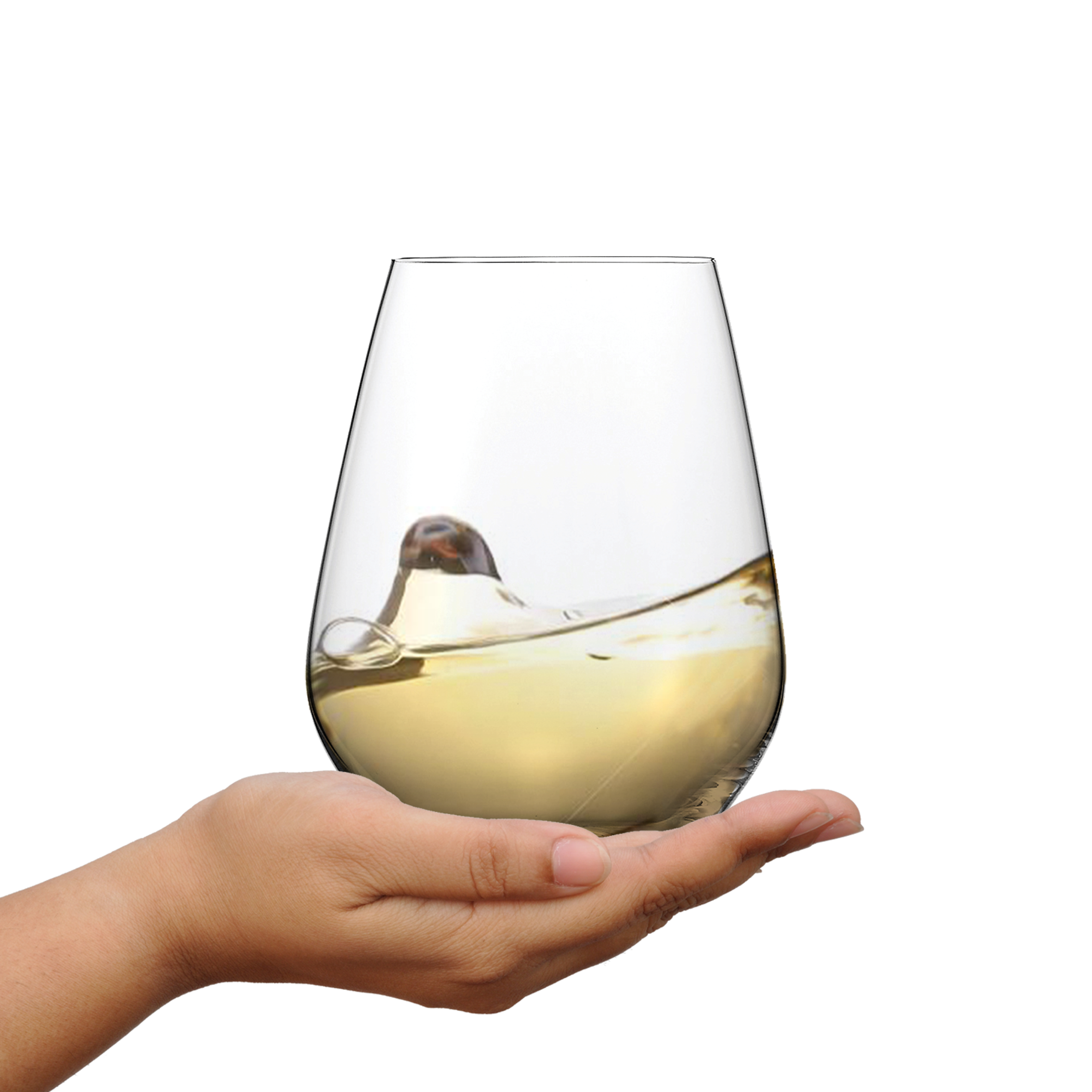 Im Gegensatz zu vielen anderen Weingläsern kommt es ganz ohne Stiel aus. Die etwas bauchigere Glasform erlaubt eine perfekte Entwicklung der Aromen, welche durch die nach oben verjüngende Form gebündelt werden.
