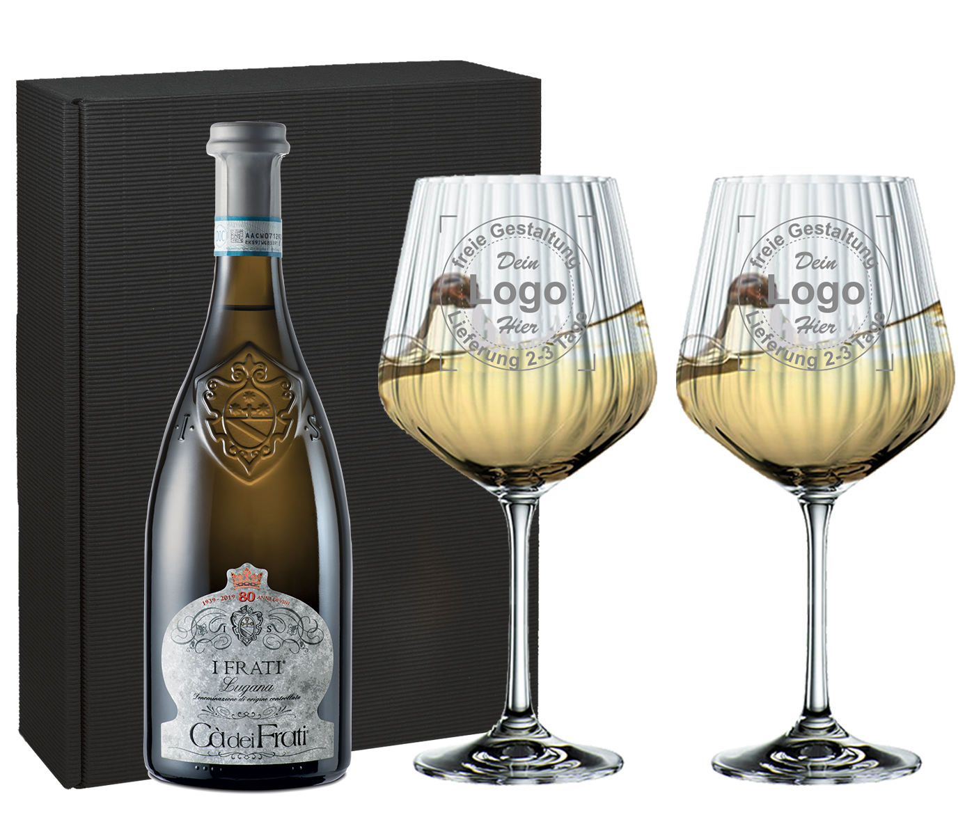 Das Set besteht aus zwei gravierten Weingläsern der Serie Nachtmann, inkl. einer Flasche Wein sowie einer passenden Geschenkverpackung.
